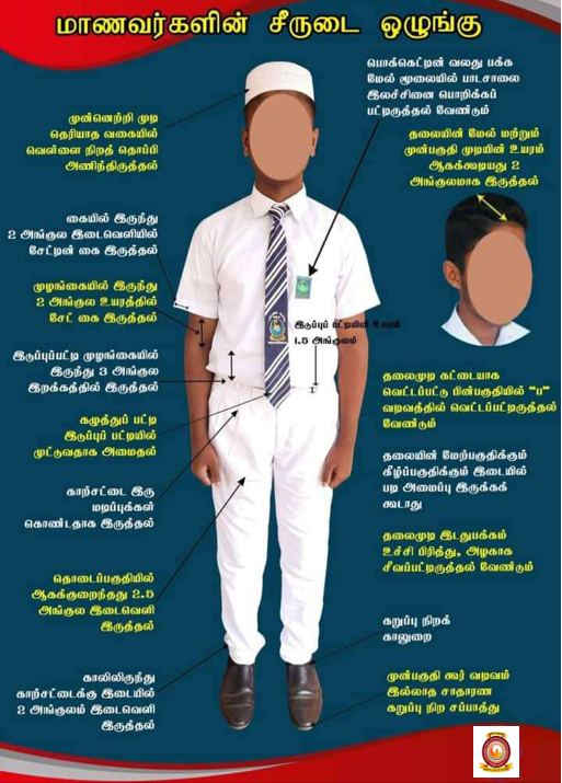 - சட்டையின் இடது பாக்கெட்டின் ஓரத்தில் பள்ளி சின்னத்தை அணிய வேண்டும்.